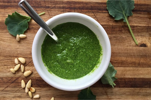Make this flavorful kale pesto once, and we know it will become a requirement in your weekly routine, just like your morning smoothie and your favorite flavor of seltzer water. Make a big jar, cover the top with olive oil, and keep it in the fridge for up to a week.