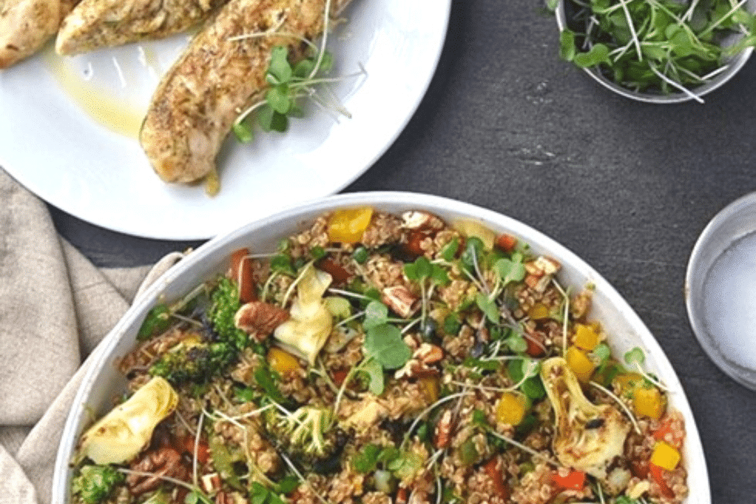 𝗟𝗲𝗺𝗼𝗻 𝗛𝗲𝗿𝗯 𝗖𝗵𝗶𝗰𝗸𝗲𝗻: 7 boneless skinless chicken thighs 1 tbsp thyme 1 tbsp rosemary 2 tbsp olive oil ½ tsp salt ¼ tsp pepper zest of one lemon 𝗪𝗮𝗿𝗺 𝗤𝘂𝗶𝗻𝗼𝗮 𝗦𝗮𝗹𝗮𝗱: 2 cups AeroFarms Micro Super Mix ½ cup quinoa 1 cup vegetable broth ½ cup red bell pepper (diced) ½ cup yellow bell pepper (diced) ½ cup green bell pepper (diced) 1 cup broccoli (chopped) ½ cup onion (diced) 1 clove garlic (minced) 2 tbsp olive oil ½ tsp salt 3 tbsp Balsamic vinegar ¼ cup artichoke hearts ¼ cup pecans (chopped)INSTRUCTIONS: