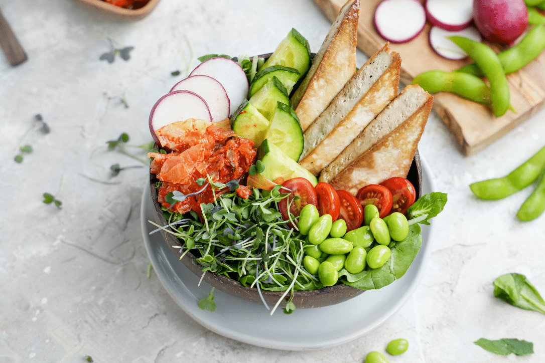 1 container AeroFarms Micro Rainbow Mix 1 container baby bok choy 1 cucumber 1 cup cherry tomatoes 1 cup edamame 5-6 radishes 1 block tofu 3 tbsp coconut aminos 1 tbsp plant-based sweetener, such as date syrup 1 tsp ginger (grated) 2 tsp lime juice 1 tsp garlic (minced) kimchiINSTRUCTIONS: