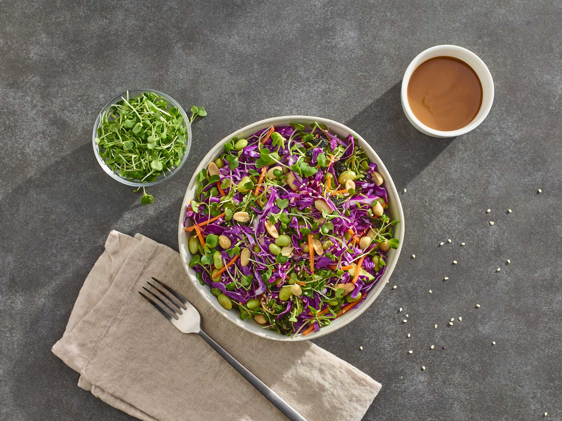 For the Salad: 3 cups finely shredded red cabbage (approximately ⅓ of a head) 2 cups thawed shelled edamame (mukimame) cups shredded carrots 1 large cucumber, seeded and sliced into half-moons ¼ cup roasted salted peanuts 2 tablespoons sesame seeds 4 sheets roasted seaweed, thinly sliced 1 cup AeroFarms micro bok choy (for topping) ----- For the Peanut Dressing: ¼ cup creamy peanut butter ¼ cup rice vinegar 1 tablespoon + 1 teaspoon soy sauce 1 ½ teaspoons toasted sesame oil ¼ teaspoon ground ginger ⅛ teaspoon granulated sugar 1 to 3 tablespoons water (to achieve desired consistency)INSTRUCTIONS: