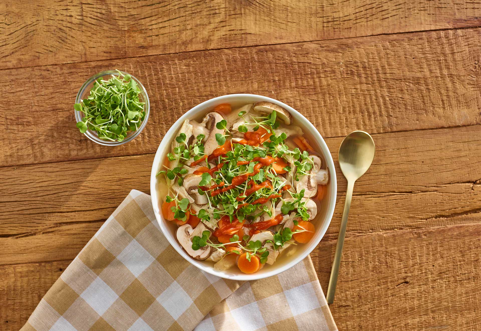 1½ tablespoons miso paste 5 cm piece fresh ginger, peeled and sliced 1 clove garlic, thinly sliced 1 carrot, thinly sliced 2 cups sliced mushrooms 1 stalk celery, including leaves, roughly sliced 200 g chicken breast, thinly sliced 2 cups AeroFarms micro bok choy 1 teaspoon sesame oil - Chili sauce (e.g., sriracha), optional, for garnish 2 slices wholegrain sourdough or other grainy breadINSTRUCTIONS: