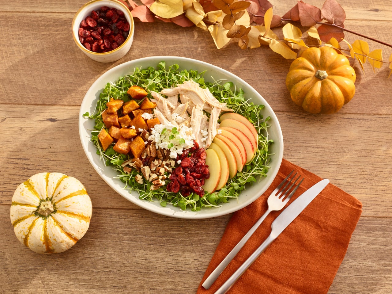 For the Bowl: 4 cup AeroFarms Micro Bok Choy (as the base) 2 medium sweet potatoes, peeled and diced 2 tbsp olive oil (for roasting) 2 tsp cinnamon 2 tsp paprika - Salt and pepper, to taste 2 cup cooked and shredded chicken breast (rotisserie chicken works well) 2 medium apples (Honeycrisp or Fuji), thinly sliced ½ cup crumbled goat cheese ¼ cup dried cranberries or raisins ¼ cup toasted pecans or walnuts ----- For the Dressing: 3 tbsp olive oil 1 tbsp apple cider vinegar 1 tsp Dijon mustard 1 tsp honey or maple syrup - Salt and pepper, to tasteINSTRUCTIONS: