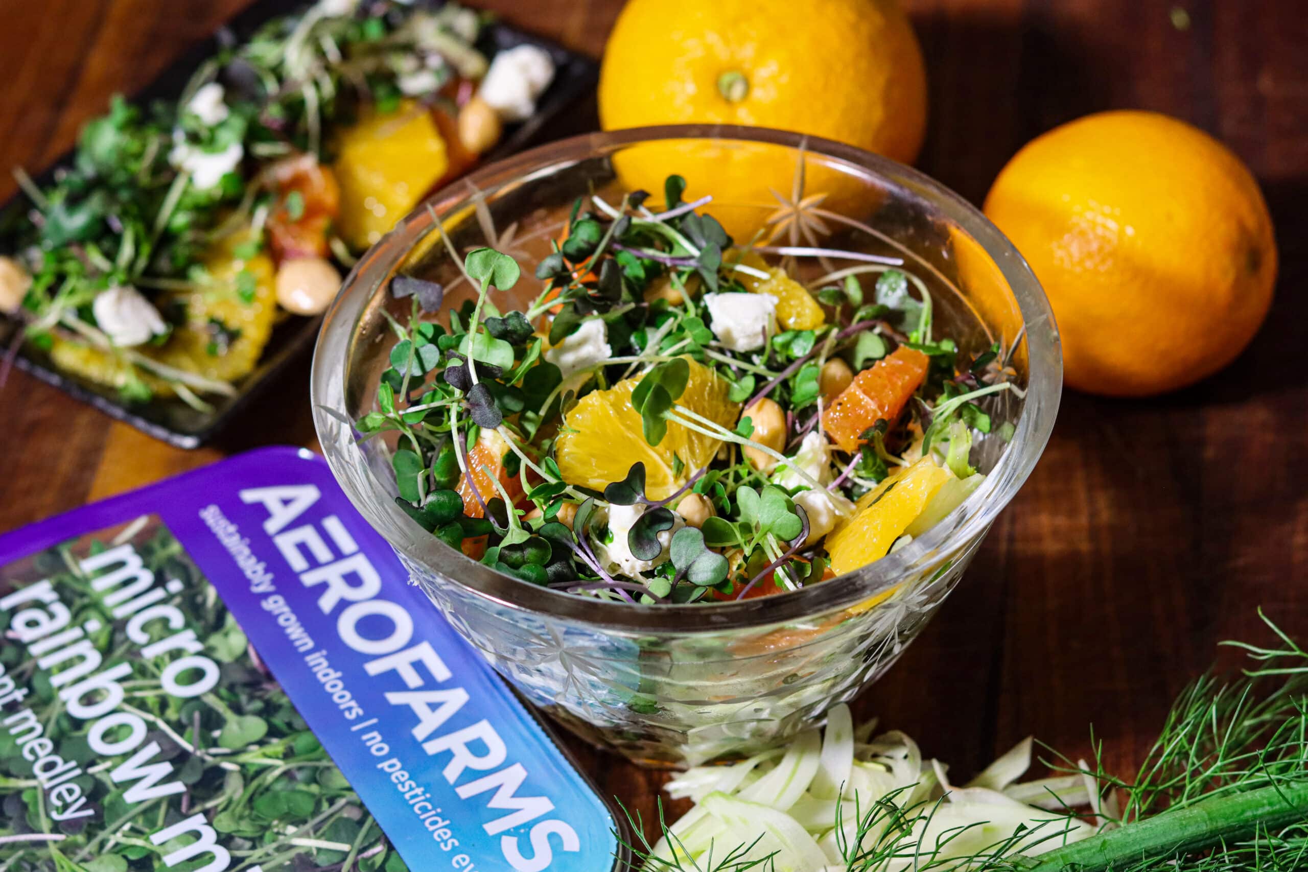 1 container AeroFarms Micro Rainbow Mix 1 navel orange 1 Cara Cara orange 1 cup fennel bulb (sliced) 1 tbsp sherry vinegar or balsamic vinegar 8 Marcona almonds 4 tbsp goat cheese pinch of saltINSTRUCTIONS: