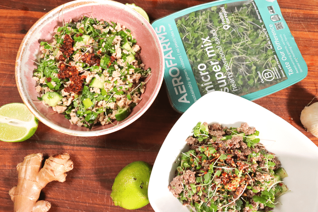 1 container of AeroFarms Micro Super Mix 1 pack of ground chicken ½ cup cilantro (chopped) 3 green onions (chopped) 1 large English cucumber (diced) 10 mint leaves ¼ cup fish sauce ¼ cup lime juice 2 tbsp glutinous rice (Jasmine rice will work) 2 tbsp vegetable oilINSTRUCTIONS: