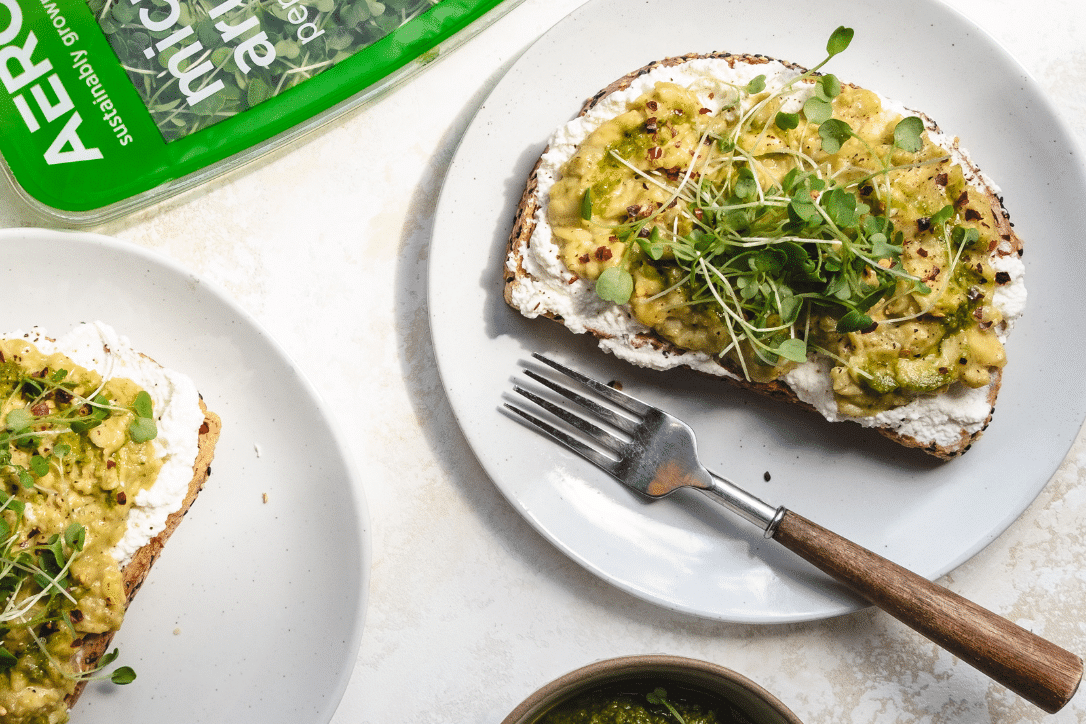 𝗠𝗶𝗰𝗿𝗼 𝗣𝗲𝘀𝘁𝗼: 2 cup AeroFarms Micro Arugula 1 cup basil 1 clove of garlic ¾ cup extra virgin olive oil ¼ cup pine nuts ½ cup parmesan cheese lemon juice from ½ a lemon salt and pepper 𝗧𝗼𝗮𝘀𝘁: 4 eggs 1 tbsp butter 4 tbsp ricotta 2 pieces of multigrain bread salt and pepper to tasteINSTRUCTIONS: