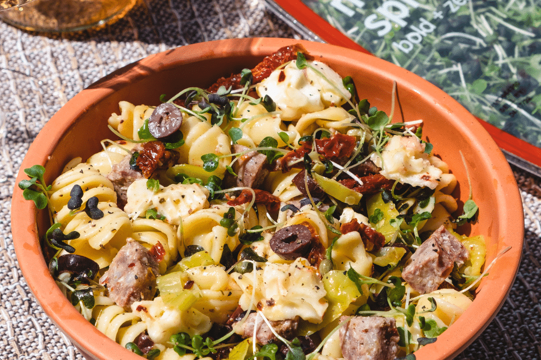 2 cup AeroFarms Micro Spicy Mix 1 pound giant fusilli ¼ cup extra-virgin olive oil 4 garlic cloves, minced ¼ tsp red pepper flakes 1 cup pepperoncini, sliced into rings 2 tbsp pepperoncini brine 2 tbsp capers ½ cup oil-packed sun-dried tomatoes, chopped ½ cup pitted-Kalamata olives, quartered 8 ounce hot salami, cut into 3/8th inch dice 8 ounce fresh mozzarella cheese mini balls salt and freshly ground black pepperINSTRUCTIONS: