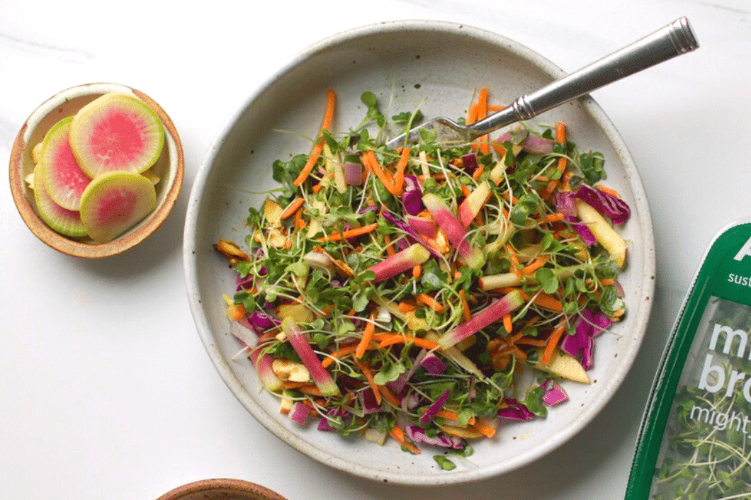𝗦𝗮𝗹𝗮𝗱: 3 cups AeroFarms Micro Brocoli 1 cup carrots (shredded) 1 cup red cabbage (sliced) ¼ cup red onion (thinly sliced) ½ cup toasted sliced almonds (reserve some for garnish) ½ cup fuji apple (cut into small chunks) ½ cup watermelon radish (thinly sliced) 𝗗𝗿𝗲𝘀𝘀𝗶𝗻𝗴: ⅔ cup orange juice 2 tbsp miso 2 tbsp almond butter 1 shallot 1 tsp Dijon mustardINSTRUCTIONS: