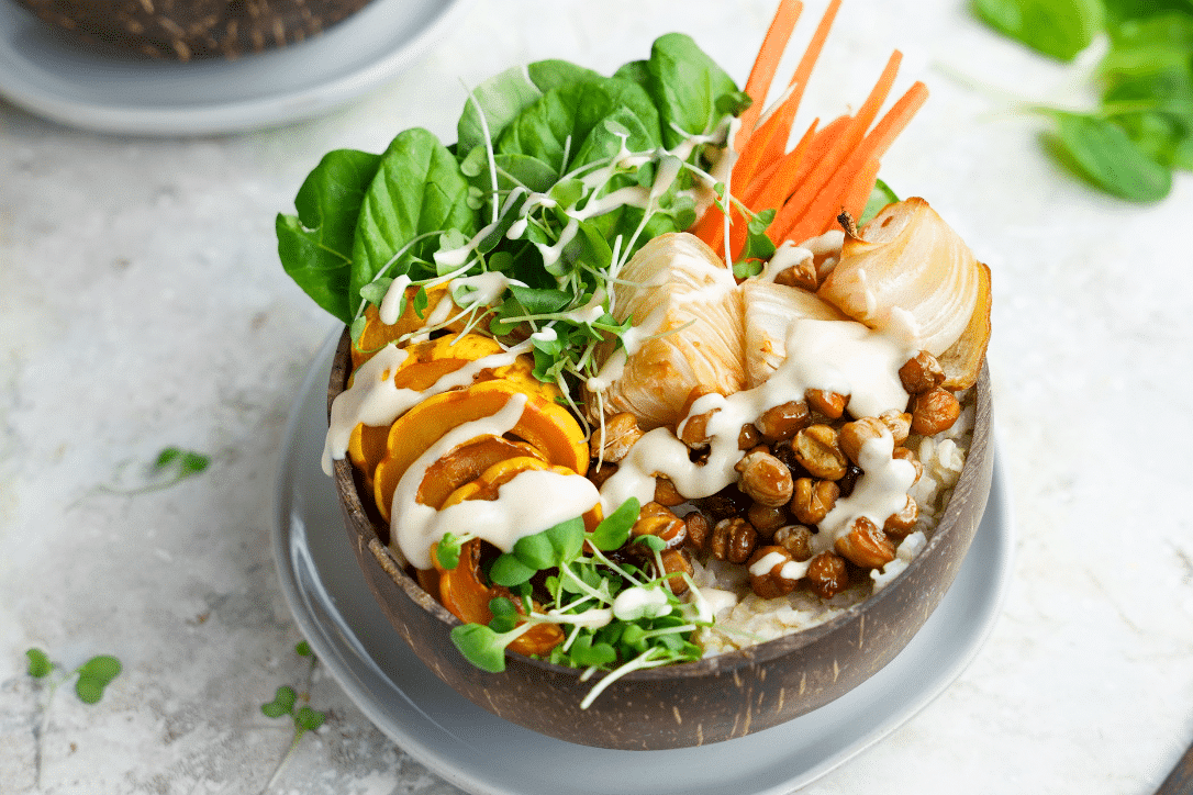 This veggie bowl is a delicious and nutritious meal that’s packed with a variety of flavors and textures. The base of the bowl is made with fluffy brown rice, which provides a source of complex carbohydrates and dietary fiber, helping you feel full and satisfied. The rice is then topped with roasted squash, chickpeas, onion, microgreens, baby bok choy, and carrots. To bring everything together, the bowl is drizzled with a creamy tahini dressing, which adds richness and depth of flavor to the dish. Tahini is made from ground sesame seeds and is a great source of healthy fats, protein, and minerals like calcium and iron. It’s a great option for anyone looking to incorporate more plant-based foods into their diet!