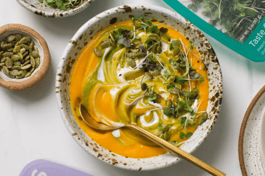 12. Serve the soup with a drizzle of the bok choy soup and with a swirl of yogurt, pumpkin seeds, and AeroFarms Micro Super Mix or your favorite microgreens.