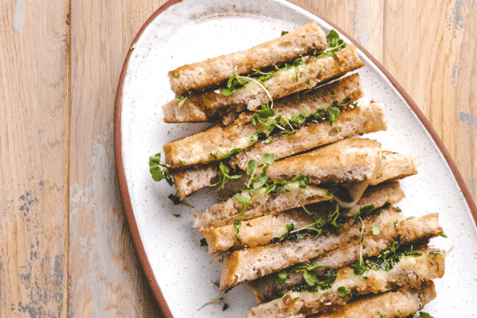 1 container AeroFarms Micro Arugula 1 loaf of fresh artisan bread (cut into thick slices) chili fig jam or traditional fig jam 6 oz Gruyère cheese (grated) 6 oz Gouda cheese (grated) butterINSTRUCTIONS: